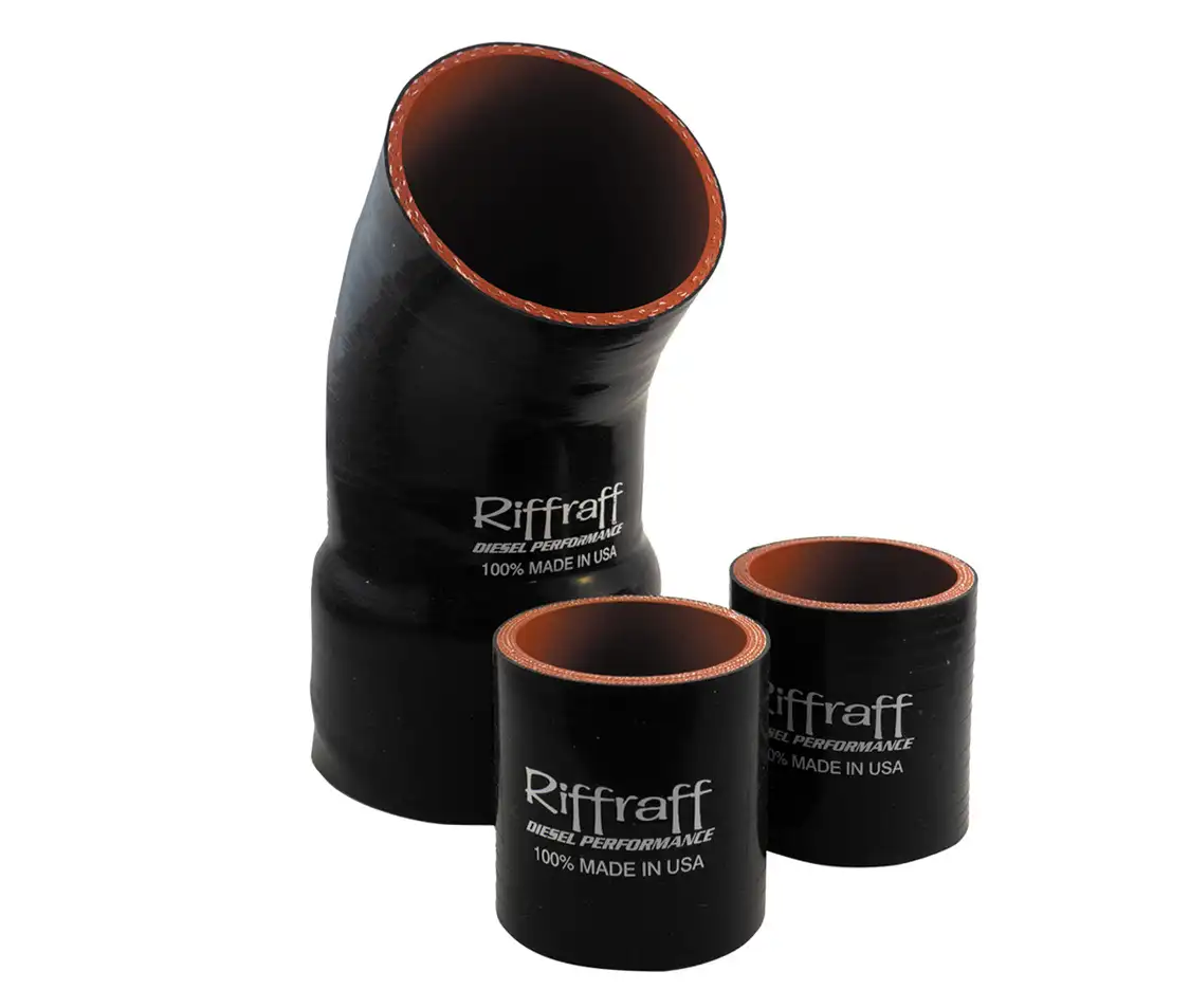 This kit is designed as a direct replacement for cracked factory pieces on 1994.5-1997 OBS Power Stroke trucks equipped with the stock turbo. The product features a black outer layer, is Aramid/Nomex reinforced for durability, is rated to a 550-degree Fahrenheit working temperature, and is made in the USA.