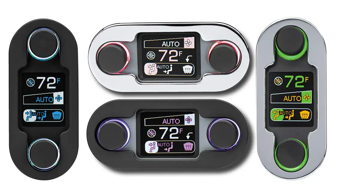 This unit plugs directly into Vintage Air’s Gen 5 (and Gen IV) A/C systems, offering the user full climate control functionality. Select your preferred temperature, and the DCC-4000 takes it from there with varying fan speeds and cooling needs to hold your preferred temp level. Available with a chrome or black housing finish, the display color theme is user-configurable, as is horizontal or vertical orientation.