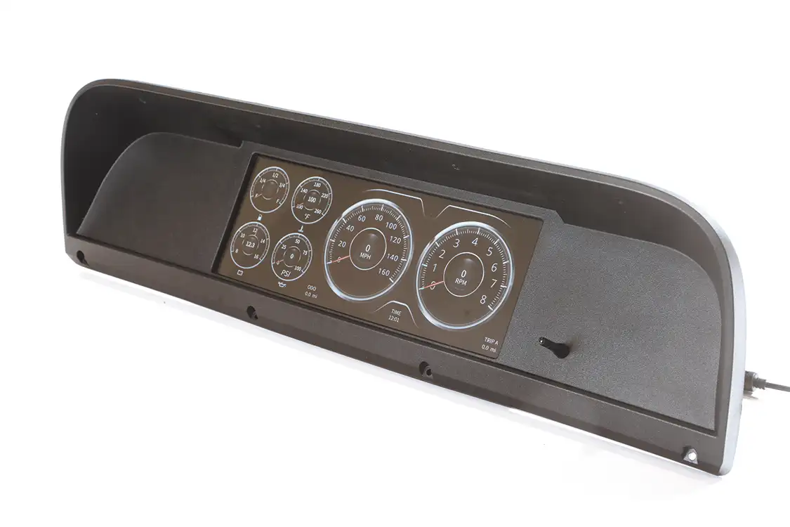 This dash is a direct-fit, injection-molded dash that includes tach, speedo, fuel level, water temp, oil pressure, and volts, all on a high-def 12.3-inch LCD screen. Each kit comes with oil and water senders, bushings, a pre-terminated and color-coded wire harness, a joystick, and cutouts for 4 additional gauges.