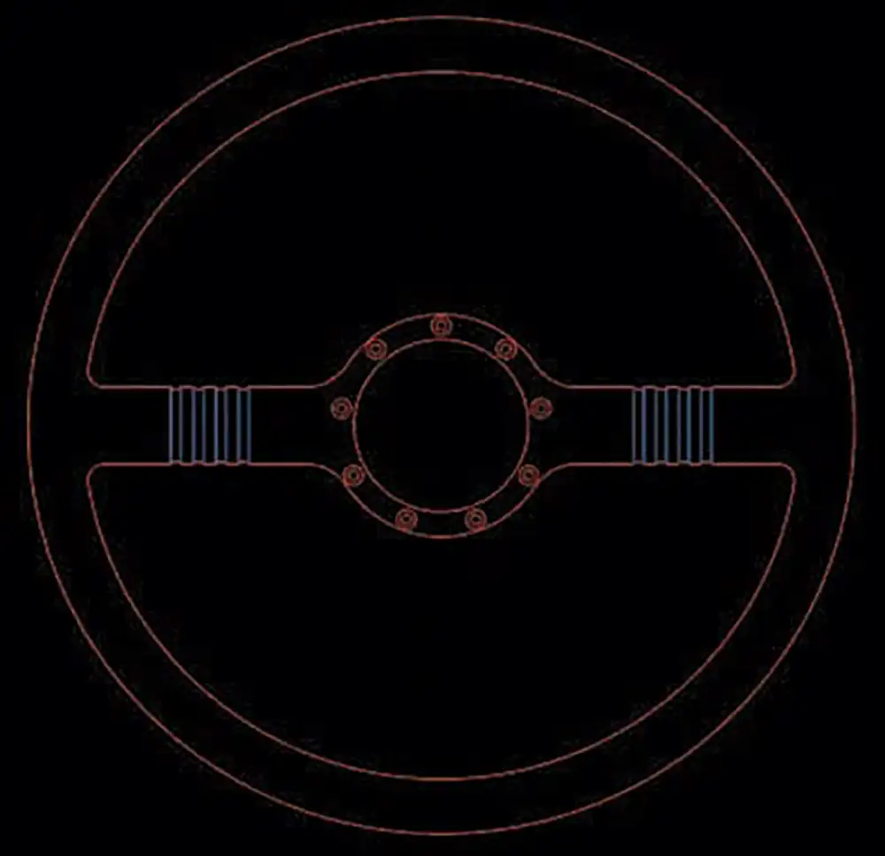 The 1940 Ford steering wheel has long been a favorite of hot rod enthusiasts thanks to its clean, uncluttered two-bar design. But we couldn’t find one offered in the same style of wheel and in a billet version, so this was our chance to recreate the classic design with our own special tweaks. The design and engineering team at Colorado Custom took our idea and created a wheel that replicates the look but features larger bars for better strength and a simplified ball mill line design that helps tie in the Segundo wheels and fins on the PML valve covers. In keeping with this classic style, we chose to go with a custom horn button too so that the hub and horn bezel would appear to be one solid piece.